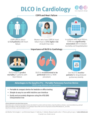 Diffusion capacity (DLCO) is a clinically useful test that provides a quantitative measure of gas transfer from the lungs to the blood. It complements spirometry in evaluating and managing patients with cardiac and/or respiratory disease.